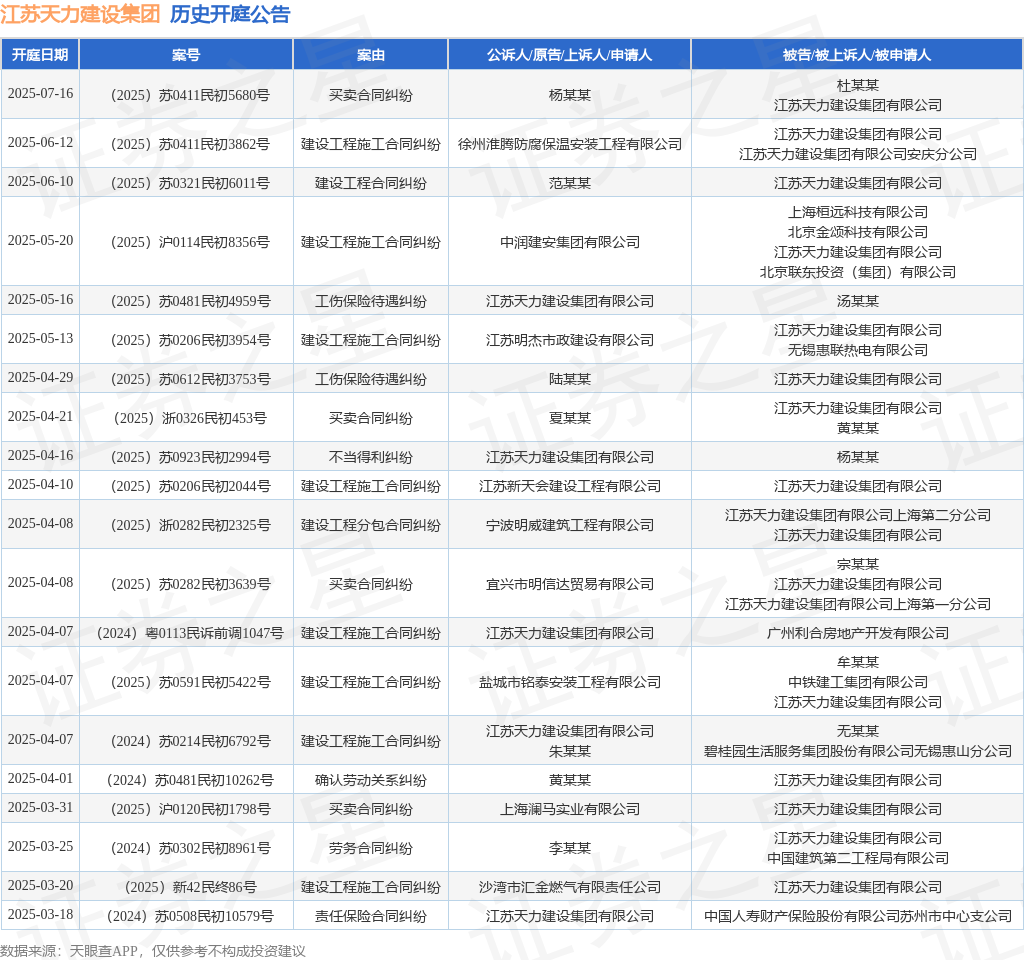 本站消息,根据天眼查APP显示,近日公布了一则江苏天力建设集团有限公司作为被告/被上诉人的开庭公告,详细内容如下: